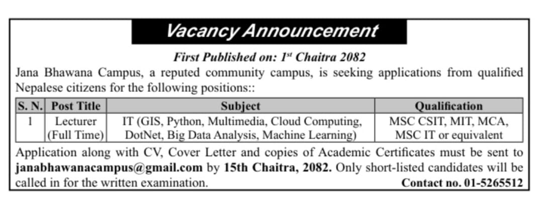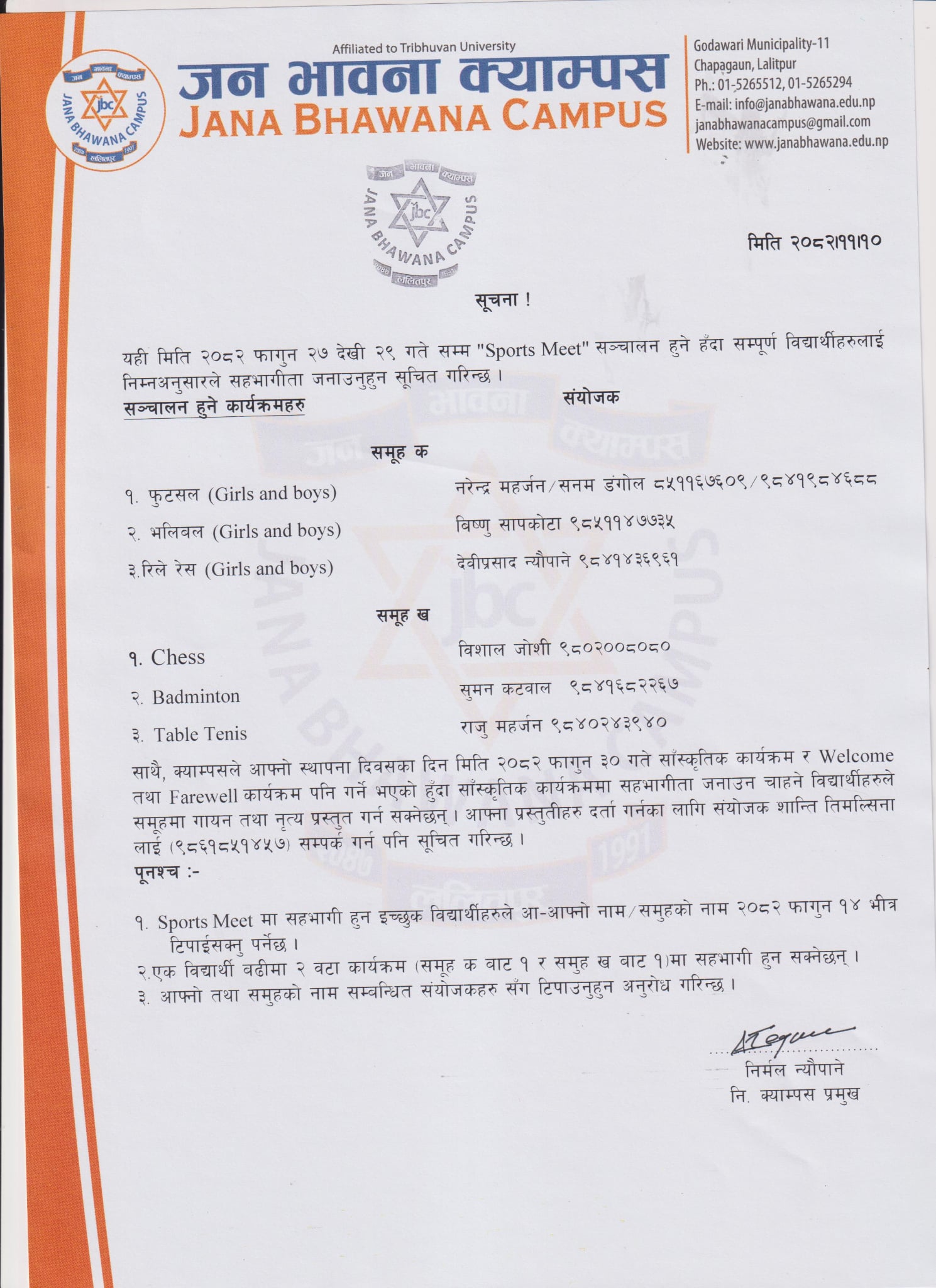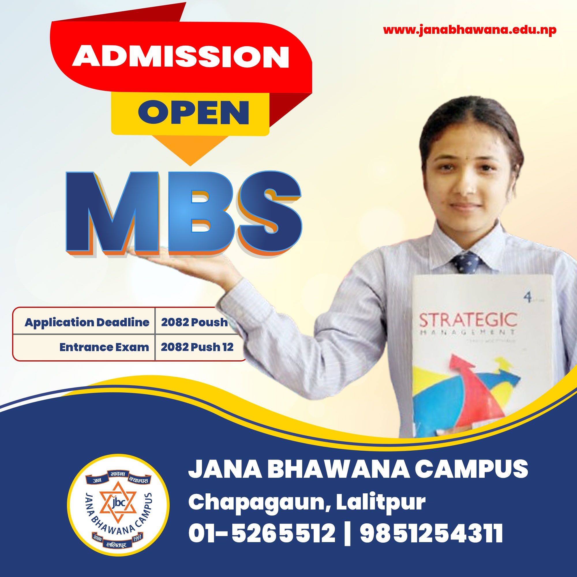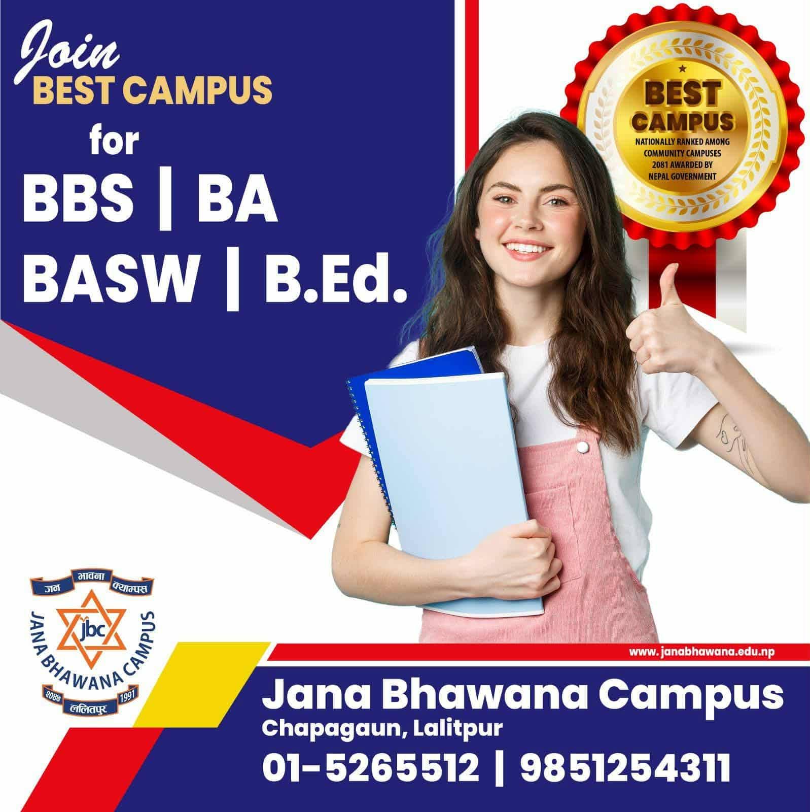 Jana Bhawana Campus, Situated at Godawari-11, Chapagaun, Lalitpur, is a leading academic institution established in 1991 by a team of renowned academicians, educationists and professionals. It was certified as a "QAA certified institution" in the year 2019 by University Grants Commission (UGC), Nepal and has been striving forward with potent determination, dedication and well-set plan to become an&nb...